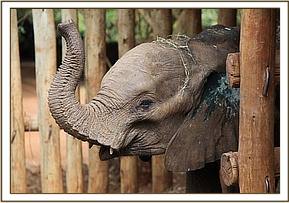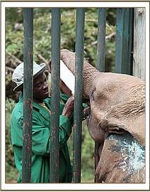 He was 2 years old, tiny tusks already protruding through the lip, and although emaciated, was not in life threatening physical condition. He was also very calm for a newcomer of this age, and by nightfall was taking milk from a hand-held bottle, and even sucking on the Keeper's fingers, albeit on the other side of the Taming Stockade partition. He is a very lucky little elephant to have escaped severe spearing and been rescued in time and as soon as he is stabilized, will be a candidate for the Ithumba Unit, there to join other two year olds who have already sprouted tusks.