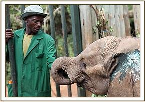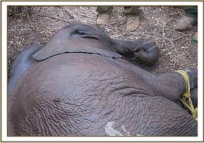 The latest orphan from this area, is a two year old bull calf whose mother is believed to be the poached cow elephant who died of poisoned arrow wounds and was found by the Trust's Ziwani De-Snaring team last month. The calf had apparently been spotted in the area by people from the village, who viewed him as a threat to their children herding livestock. They said that he had visited the body of his slain mother several times. His presence was first reported to the Bonham Scouts who alerted the Trust' Field Officer at Kaluku, and he in turn contacted the Keepers based at the Trust's Voi Rehabilitation Elephant Stockades.