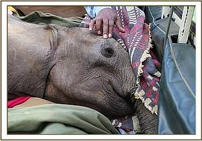 Upon arrival our team were welcomed by the Lodge staff and were immediately shown where the elephant was sheltering in thick undergrowth. She cut an extremely lonely figure, and according to reports, sought the camp staff’s company and safety each night by sleeping next to Samburu tribesman Dipa Lenyankera’s tent. This was understandable because by now she had a nasty wound under the tail having been mauled by a hyena. She put up little resistance when our Keepers swooped in to restrain her, after which she was laid on the usual canvas stretcher that our team had brought and with her legs strapped she was now ready for transportation to the waiting plane.