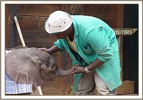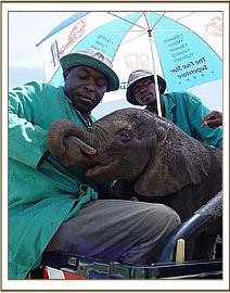 Unfortunately, the immobilisation of the mother did not go entirely according to plan. The mother was put to sleep her wound was cleaned, the vet was also able to asertain that the mother was virtually without milk, her breasts having srivelled out of reach of the calf even, when unexpectedly she woke up before an antibiotic administered. With the elephant now on its feet, everyone had to scramble to safety, including the Vet. It was decided that Seyia would have no chance of survival given his present dehyrated condition, and his mothers present condition. Obviously, if he was not to end up making a meal for the hyaenas, he had to be treated as an orphan, and little Seyia came into our care, the 60th elephant baby the Trust has been able to save, assuming that he makes it. We estimate his age to be about 1 week, the worry being whether his mother had been able to produce the vital first colostrums milk to give him the antibodies he needs to cope with life.