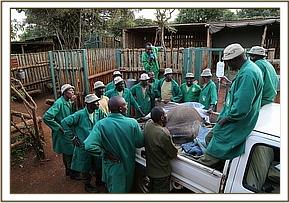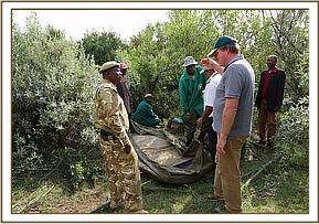 Angela Sheldrick from The David Sheldrick Wildlife Trust was called and immediately a rescue was mobilized and the DSWT rescue team landed at 2.20pm on Simba Farm. The farm management could not have been more helpful, cutting their fence in order for the land cruiser and rescue teams to have easy access to where the young orphan was, and laying on both man power and vehicles to assist.