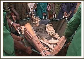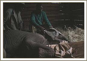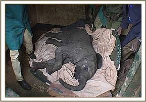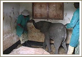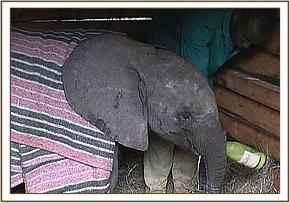 "Sweet Sally" is 6 months old - a very difficult age to become orphaned, because by then a calf is well bonded to its mother and elephant family, and will inevitably sink into deep grieving and depression which triggers physical problems such as stress ulcers. "Sweet Sally" is a very gentle, sensitive little elephant, and hence her grief was more intense than most. For a whole week she refused all milk, subsisting only on water laced with dehydration salts and poured into her mouth from a bucket. She refused to suck the rubber nipple of a feeding bottle; was unable to sleep, traumatised by the sound of every overhead plane or helicopter and left us despairing of ever being able to persuade her to want to live!