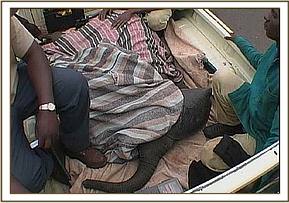 An elephant named for a very brave girl called Sally Dunne is now with us, a victim of the otherwise successful recent relocation of 52 elephants from a small fenced Ranch surrounded by settlement called "Sweetwater's" to Meru National Park in the North. Mother and calf were amongst those moved, but en route their vehicle got bogged, and an already traumatic journey for these two turned into a living nightmare.