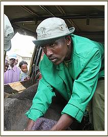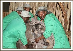 It is very likely that this calfs elephant herd strayed into the community lands around the Judea area, near Meere river, and in the ensuring human conflict the mother was either injured and later died, or the calf was left behind in the chaos. The villages had observed the calf alone in the area for three days before reporting it to the authorities, and a wound between his shoulder blades indicates that they tried to kill him too. His presence was reported to KWS Platoon Commander Mt. Kenya Mr. James Kailangush who responded in time to rescue the baby as many local villages were milling around it with ill intent. Having already reported this to us through Dr. Mutinda they proceeded to capture the calf with rangers from the Kenyan Wildlife service, Scouts for the Mount Kenya Trust along with the aid of some helpful community members too.