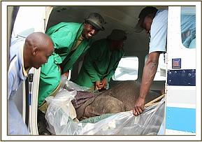 In the meantime from DSWTs Nairobi HQ the rescue team comprising of our experienced Keepers took off from Wilson airport in a Cessna Caravan, for the short 35 minute flight to Nanyuki airstrip where the calf was driven to by KWS. Once in Nanyuki, the calf still conscious and strapped down in the vehicle our Keepers were able to take a close look at the injuries and ascertain that they were not as deep as originally thought. Having cleaned the wound, and prepared the calf for the flight he was loaded onto the aircraft and flown back to Wilson arriving late evening at the Nairobi Nursery.