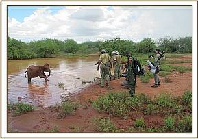 Meanwhile at the Nairobi HQ, the team was prepared for a rescue and a rescue plane was put on standby at Wilson Airport, waiting for the go-ahead from the field team in Tsavo. With GPS coordinates and guidance from Nick, who was still monitoring the elephant calf from the air, the ground team finally made it to the location, but the calf was now 2kms from the road so the rangers and keepers approached the calf stealthily through the bush.