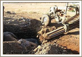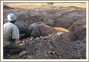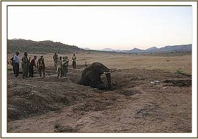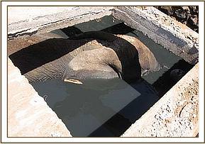 The Tsavo Mobile Veterinary unit run by The David Sheldrick WildlifeTrust thanks to a grant from Vier Photen, were called to Ngulia inTsavo West to assist rescue two bull elephants that had fallen into the septic tank at the Ngulia safari lodge. The animals were resting on the septic tank the previous night when the roofing slab gave in to their weight throwing the animals into the fully filled 10 feet sewage tank beneath. By the time the David Sheldrick WildlifeTrust team arrived on the scene, half the tank had been drained using a water pump giving some relief to the elephants. Upon evaluating the scene and considering the possible options available it was decided the best course of action was to create an escape route on the one side of the tank so that eventually the animals would be able to climb out on their own. Thanks to the dug escape route, filling up the tank with soil as well, along with the continued drainage of the sewage, the two bulls were eventually able to climb to safety.