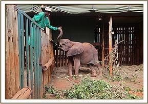 By the time she arrived at the Nursery It was 8 p.m at night. She was placed into a large taming stockade next to Dupotto, and given medication before being lifted to her feet. All the other resident orphans were all communicating with her from their night stockades and this calmed her enormously. Her stockade had been filled with green vegetation and she was fed oral rehydration salts, as well as taking a bottle of milk.