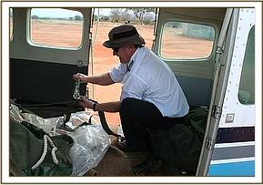 Having landed at Voi our Nairobi Elephant Keepers were driven to the Voi Elephant Stockades, the team was then faced with the problem of having to overpower an extremely wild elephant, who simply wanted to kill every human in sight. This was a challenging prospect and took some doing, it being necessary to avoid sedation, due to the risk of bloat, which, in the past, has cost the life of orphans of that age immobilized for what was to be a long journey. She was, however, given a Stressnil injection, which didn't seem to have much affect, because the calf gave the Keepers a real run around before she was overpowered, her legs tied, and lain down on the rescue tarpaulin, in order to be driven to the airfield and eventually loaded onto the plane.