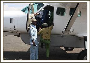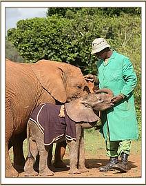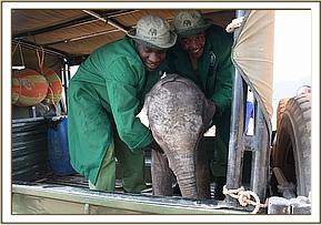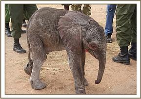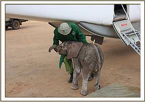 The David Sheldrick Wildlife Trust Rescue team, armed with all the usual paraphernalia, and the milk, left Wilson airport at 2.30 p.m. and after a one hour flight landed at the Airfield where the one week old infant elephant awaited them, standing trustingly beside his Samburu Rescuers and the Rangers. Having been fed Electrolytes to counteract dehydration followed by some formula milk, and given its first prophylactic antibiotic injection, the baby elephant was strapped onto the Rescue mattress, loaded onto the plane and flown to Nairobi, arriving at the Nursery in the late evening. It was a baby girl, and has been named Wasin after the nearby massif known locally as Ol Donyo Wasin, Wasin being the local term for the trees that are found growing on the summit. She arrive a bit wobbly, and with an umbilicus that needed some attention, the little elephant was still strong, taking her milk, and so far is doing well.