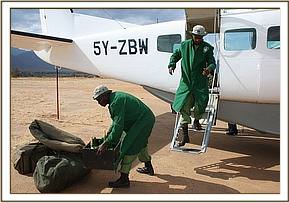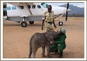 Very fortunately, the Samburu elders who retrieved and rescued the calf were already aware from previous elephant rescues that the little elephant must not be fed cows’ milk, but only given water until the Rescue team arrived with the correct milk formula for an infant elephant. The Namunyak Conservancy officials based at Wamba town, alerted the KWS officials and immediately sent a vehicle to collect the tiny calf and take it to the nearby Airfield to await the arrival of the Rescue plane.