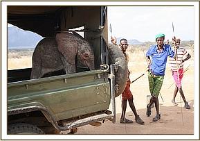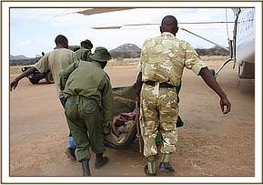 The Samburu Elders who rescued the elephant were named Lengiwa, Lititia and Lerno. The Namunyak Trust Manager is Loila Letinena who was alerted by Kalmnon Leogura, the Radio Operator at Namunyak Wildlife Conservancy Trust. KWS Rangers who accompanied the elephant to the Airfield were Jestin Lesirite, Lebengin Leshongoro, Sgt. Lekapina and Cpl. Silas Rotich. The Driver of the vehicle was Mark Lesimirdan, and the Trust’s Rescue Team was comprised of Keepers Abdi, Hassan and Asman.