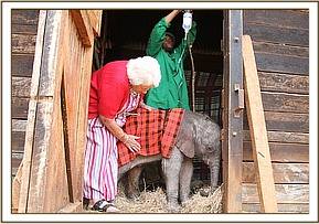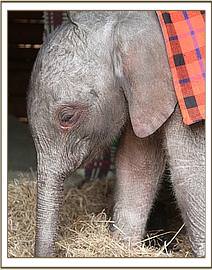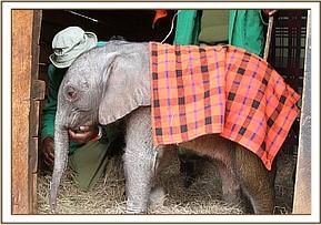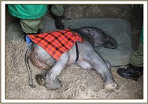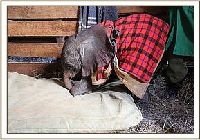 We called this calf Kamok, a name taken from Olpejita Ranch. Given that her umbilical cord remained soft and fresh, and the pads on her feet where clean and hardly used and her ears petal pink we took the precaution of assuming this calf had never received her mothers colostrums and transfused plasma from a full grown healthy elephant into her tiny body to ensure she had some natural antibodies. This happened while she slept on a mattress covered in a blanket and slept, exhausted from her ordeal. On waking she took to her milk bottle immediately and followed trustingly all those around her. Very soon she latched onto her Keepers and security blanket that all infant baby elephants seem to love and get so much comfort from just like human babies. Her wobbly joints have thankfully grown stronger over time and she is now able to walk long distances following her Keepers.