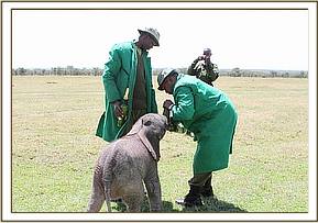 The David Sheldrick Wildlife Trust immediately mobilized a rescue team and flew to Olpejita, a 40 minute flight from Nairobi. The calf was already waiting for the rescue team on the Olpejita airfield having been transported there from Kiparo boma by Olpejita Scouts. The DSWT Keepers immediately gave the hungry baby a bottle of milk and then prepared her for the journey home, ensuring that she was placed on a drip for the duration of the flight to boost her strength further.