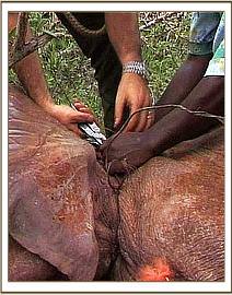 On that particular occasion Burra’s herd never made it because they were driven back from community lands by a Helicopter. By then he was too weak to keep abreast of his terrified fleeing family so he fell behind, and it was clear to those in the Helicopter that he had serious injuries. They landed, and with the help of the ground unit, rapidly overpowered him and were shocked to see the extent of his suffering – a suppurating ear three quarters severed, a steel cable deeply imbedded in the back of his neck and cutting into his throat with thick yellow pus oozing from both wounds, and a body pathetically thin, feeble and wracked with pain.