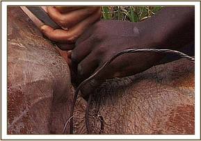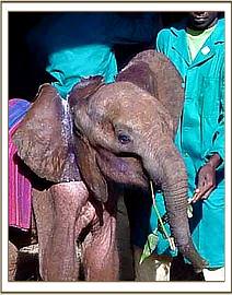 Burra was an orphan of the cruel and indiscriminate Bushmeat Trade, caught around the neck and through one ear by a thick steel cable. He was still with his elephant mother at the time, and she obviously pulled him free, for as the noose tightened, the steel cable cut his ear almost in two and dug deep into the back of his neck as well as the tender flesh around his throat, almost throttling him. It was so tight that he could barely swallow and had great difficulty even lifting his head in order to suckle his mother. Small wonder then that he rapidly became emaciated and weak, and by the time he was spotted, was not far off dying from starvation but still with his elephant mother.