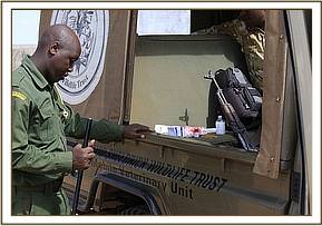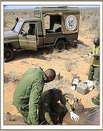 It was late in the evening, too late to respond, so Nick planned together with KWS that the KWS/DSWT Mobile Veterinary Unit, headed by Dr. Poghon, would meet with him early the next morning. Today, the morning of the 16th of June, after two hours of searching for her from the air Nick finally caught up with her 5 kms away from where she was seen the previous day. He landed on a nearby road and waited for Dr. Poghon and the team, and together they drove off road to the location where the elephant was spotted from the air.
