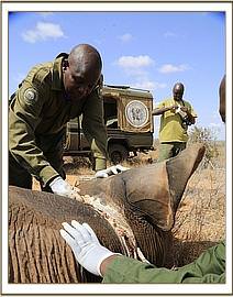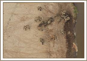 On the 15th of June, Nick Trent, the David Sheldrick Wildlife Chief pilot, was flying back from Lamu to the Trust's Kaluku headquarters. He observed in Tsavo East National Park while flying along the Galana River a number of elephants in or on the waters edge. Nick noticed one female spraying water excessively on her head, and instinctively felt that something was wrong so circled to take a second and more closer look.