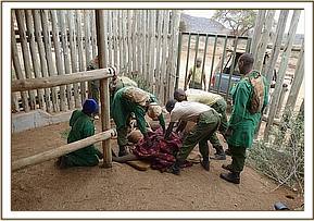 Finally, much to our delight and relief, they were sighted by our Yatta Anti-Poaching team while out on patrol two months later on the 4th of August, while patrolling along the Athi River in an area of Tsavo known as Gazi. They were in the company of wild elephant and within an area that has little infrastructure, so any possibility of a rescue was extremely challenging. In fact for the next two days a rescue proved impossible given their inaccessible location, and the teams waited patiently for the conditions to improve. On the 6th, Kelelari and Dupotto were located from the air early in the morning, this time on the top of the Yatta plateaux and just a few hundred meters from an old unused vehicle track. On this day they were in the company of some big bulls. Everything required for a successful capture was mobilized and put into place, and this alone was a logistical nightmare. While all this was happening our dedicated pilots circled in two planes taking it in turns to keep the elephants in sight. Finally, once all vehicles and men were in place, Dupotto was then separated from Kelelari by the helicopter and darted by Vet, Dr. Ephantus from the air. In no time she fell asleep and slumped to the ground, and the Keepers were able to run through the dense bush to where she fell, guided by the helicopter above. In the meantime the vehicle battered through the dense undergrowth to where she lay. Once she was stabilized and rolled onto the canvas stretcher she was loaded onto the back of a Ford truck, and this is where the problem was. She was so heavy that all the men on hand could not lift her into the back of the Ford pickup. The Vet even contemplated waking her and aborting the mission, but in one last ditch effort, everybody straining beyond what was humanly possible but driven by a fierce desire to retrieve Dupotto, who was looking in poor condition, she was lifted high enough to pull her into the pick. Robert Carr-Hartley then drove her the two hour journey to Ithumba with Dr. Ephantus in the back with Dupotto, keeping her lightly sedated for most of the journey.