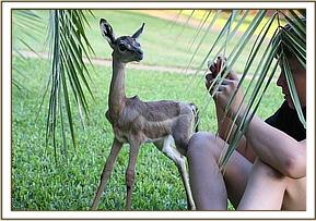 The prison staff were quite unsure what to do with this strange new arrival, so whilst they decided the best course of action they kept the orphaned gerenuk in one of their livestock stables which the lonely little gerenuk had followed the goats into. The goats were obviously rather confused at this new addition to their family but soon became used to the baby gerenuk, treating him just like another goat until you could barely notice him huddled amongst the rest of the herd. After two days of living like a goat the staff had finally managed to make contact with the DSWT rangers in Tsavo and reported the story of this remarkable little antelope.