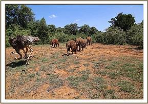 Each day the orphaned elephants and the 2 ostriches were taken on long walks down to the open plains of Nairobi National Park and sometimes they had the opportunity to mix with the wild ostriches of Nairobi Park, and must opportunely, one day, Pod never returned as usual with the herd. The elephants and Pea returned without him, and we can only assume that Pod joined the wild ostriches, since there was no evidence to suggest otherwise.