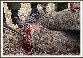 Another commonly used mode of poaching is snaring. For elephants the poachers fix cable snares (usually winch wire) to sturdy trees near elephant pathways. These hidden traps are indiscriminate - a snare can fasten around a leg, a trunk or a neck or an elephant or a body part of any animal. An elephant calf without ivory can be equally as vulnerable to this mode of poaching as our recent orphan Mbirikani graphically illustrates. The cables create excruciating wounds that slowly debilitate the animal until they succumb to their injuries.