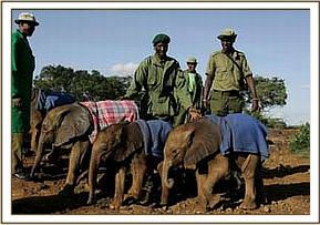 The Scouts from the West Gate Conservancy in Samburu who rescued both Lempaute and Loijuk got to meet them again this month. The Trust sponsored their journey down from Samburu to Nairobi in order for them to spend time with the Nursery orphans, and particularly the two orphans they had saved, Loijuk and Lempaute. They were able to learn more about the Project first hand and got to spend quality time with the Nursery orphans and their Keepers. They were all amazed at Loijuk’s progress, a far cry from the emaciated calf they had last seen loaded onto the rescue aircraft nearly a year ago. Lempaute enchanted them too, as she was clearly attached to her Keepers staying close to them at all times, but quick to play and frolic for her captivated audience.