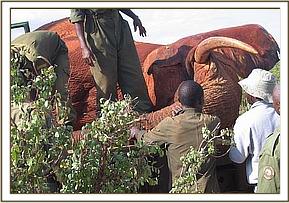 In October 2005, attempts were made to drive the elephants out with a helicopter through selected areas of the fence, which had been brought down and camouflaged with bushes. The elephants stubbornly refused to go out and The Kenyan Wildlife Service decided to initiate other options. One of these options was to immobilise some, transport them and revive them outside the sanctuary close to watering points. To assess the success of this option, a small capture team comprising of two vets, a technician, four rangers and four drivers were sent to Ngulia between the 26th of June and 10th of July to undertake the exercise before a bigger translocation is planned. Thirty-eight animals were immobilised and removed from the sanctuary. This comprised of 35 bulls and a small family of three. There was no mortality.