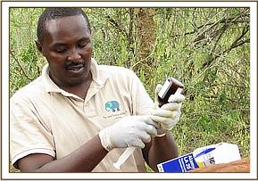 Having continued monitoring the progress of this elephant and despite the bull appearing to be slowing recovering, his leg still seemed problematic, so it was decided that a second follow up treatment was needed. Dr Njoroge of the new Amboseli Veterinary Unit drove to the site of the elephant on the 20th May directed by the DSWT pilot. Darting went well and Dr Njoroge further examined the wound on the inside of his left leg, cleaning it out well and filling it in with green clay, before he gave the bull a fresh dose of antibiotics.