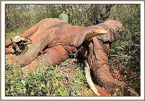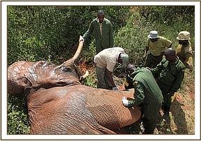 On examination the vet found a very small wound in the elephant's upper left leg. It looked like an arrow wound, but after extensive probing nothing was removed. There was nothing else to be done other than to administer long lasting antibiotics. Finishing up, Dr Poghon administered the reversal drug to a vein in the ear, while a rope was hooked around a huge tusk and attached to the rear of one of the vehicles. As the bull rolled his massive body to rise the vehicle then pulled in tandem, helping him up. The bull balanced himself slowly, unable to use his left front leg, before he pulled himself up with huge strength and effort and slid the rope off his tusk with his trunk. He staggered around and looked like he was going to fall over, but he quickly regained his balance and stood still, listening. After a short while he moved off under a tree and that's where he stayed for a while.