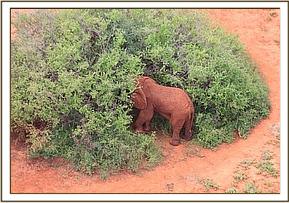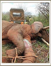 At 0715 the next morning the Trust's Top Cub was airborne heading to locate the bull elephant once again. The vet was on his way from Voi and the helicopter was estimated to arrive shortly. The DSWT ground team in the area was then en-route to collect KWS personnel and head to the meeting point, which was a short distance from where the elephant was sighted the afternoon before. The vet, the helicopter and the ground teams were in place whilst the Top Cub had already sighted the elephant just 5km away. The ground team made their way through the dense bush on foot, whilst the helicopter with Dr Poghon the vet, took to the sky to find the bull and dart him from the air whilst the DSWT pilot continued to direct the ground teams and vehicles to the correct location, as they had the essential manpower, ropes, water and drugs necessary to treat the elephant.