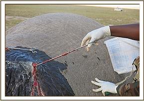 The team flew for about 45 minutes before they sighted the huge bull with a wound oozing pus high on his left hip. KWS Veterinary Officer Dr. Njoroge concluded that the wound required treatment. DSWT pilot Humphrey guided the elephant out from the dense vegetation onto a more suitable open area and then landed so that Dr Njoroge could prepare his dart gun. Once everything was planned and prepared they then took off again, this time with Dr. Njoroge in the back with his dart gun at the ready and the doors off. "Tim" was darted successfully from the air, and went down nine minutes later.
