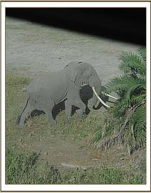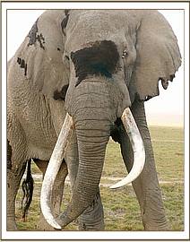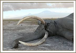 This magnificent elephant of 45 years old was treated for a deep spear wound. The wound was septic, and was estimated to be one week old. It required thorough cleaning and the narcotic flesh to be cut away and antibiotics administered. Then green clay was placed into the wound in order to keep further infection at bay. After a 25 minute operation Dr. Njoroge administered the revival drug and the bull was up on his feet by 6pm looking majestic and encircled by a rainbow. Beautiful light streaming in from the west shone on "Tim" and his rescue team, with Mt. Kilimanjaro free from cloud as a backdrop.