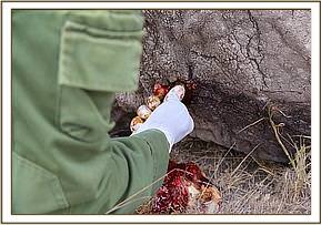 The treatment was successful and although very little pus came out of the wound it was deep, and there is a chance that follow-up treatment will be required should the wound begin to swell. The cavity was cleaned well, administered with antibiotics and then packed with green clay to assist healing, and to keep infection at bay. Dr Poghon finished the procedure by giving Ulysses anti-inflammatory painkillers. The prognosis for a full recovery was very positive. After revival, Ulysses got to his feet and with a very telling backward glance, he ambled off in the direction of the swamp.