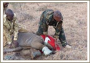 The DSWT/KWS Meru Mobile Veterinary Unit headed by seconded KWS Veterinary Officer Bernard Rono was called upon to respond immediately. The tiny snared elephant was in a herd of 30 elephants who seemed agitated when the land cruiser approached. The injured calf’s mother had to be darted as it would have been impossible to otherwise treat the tiny calf. Once his mother was asleep the team were quick to restrain the baby to avoid the risk of anesthetic and cut away the snare and necrotic flesh which must have been causing him unspeakable agony. The snare was on the right forelimb and had cut through the skin causing a deep severely infected wound and the foot was extremely swollen. After the wound was cleaned, antibiotic and anti-inflammatory drugs were administered by intramuscular injection and finally green clay applied.