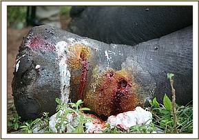 Recently the springs were visited regularly by a wounded bull elephant whose suppurating multiple arrow wounds suggested he was a victim of human wildlife conflict. The Trust flew a KWS vet Dr. Poghon into the area to immobilize the bull and treat his wounds. The septicemia was however too deep seated for him to fully recover and he succumbed to his injuries six days after treatment.