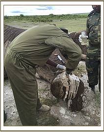 The injury was already becoming infected and the bull could risk the infection spreading either into the blood stream or to the rest of his foot, with dire consequences. Using large syringes the dirt and debris were cleaned from the wound and the dead and necrotic tissue cut away. Although he was given a good prognosis Dr Poghon suggested follow up treatment after one month. After reversing the anaesthetic this beautiful boy gradually awoke and rose to his feet ambling slowly away confused by events. KWS will monitor him in the coming weeks and if required he will receive a second treatment.