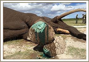 The dart gun was prepared and the team slowly trailed the bull in a vehicle so as not to alarm him. Once stationary beside a grassy area he was darted in the rump and immobilised after 12 minutes. Not unsurprisingly for such a large bull he fell with a thud, on his haunches and was pushed over by the team so that he lay recumbent on his side with the injured foot exposed easily for treatment.