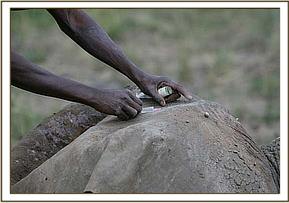 During the late afternoon of the 12th September, 2006, we received a call from Kicheche Camp in the Masai Mara National Reserve reporting a seriously wounded mother elephant with a one year old calf at foot. Great pieces of necrotic flesh were apparently hanging from a horrendous injury to one of her breasts, and a large abscess higher up on her body was exuding copious quantities of pus. This injury could possibly have been caused by a spear thrown from above the elephant which penetrated the shoulder flesh and came out at the breast.