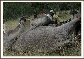 Since Dr. Ndeereh of the Trust’s Mobile Veterinary Unit was involved with the translocation of elephants out of the Ngulia Rhino Sanctuary in Tsavo West, and therefore not available, frantic phone calls to K.W.S. resulted in another Vet from their Veterinary pool returning to Nairobi from the Lewa Conservancy on the scheduled daily Air Kenya flight. Fortunately, the timing and communication worked in our favour and Dr. Chege was able to return in time and joined by Robert Carr-Hartley they caught the chartered flight to the Mara at 2 p.m. on the 13th.