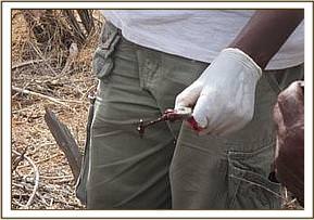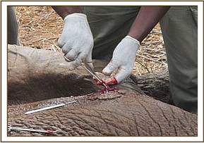 When the vet arrived at the scene the young bull was immediately darted and a large poisoned arrow embedded deep into the calf's leg was located and removed. The necrotic flesh was cut away and the wound was cleaned, before antibiotics were administered and green clay was applied to the wound. When the bull, who although young was now old enough to look after himself, was revived it was evident that the operation had provided instant relief. All at the DSWT are hopeful that this young bull will make a full recovery in time thanks to those who first reported his plight and all those involved in his rescue and treatment.