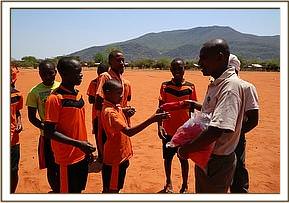 The final awards were for the fairest players, with Donald Kimbio chosen from the football teams and Beatrice Mwakoi from the netball. With broad smiles as they stood in front of their peers to receive their awards, each was presented with a shield trophy, to be engraved with their name, a cap and a signed football or netball book.