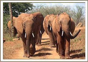 Following the death of Mweiga on the 22nd December, 2007, whose heart failed her as she was returning to the Stockades in the evening, Natumi’s group of orphans never returned to the Stockades for 3 full months. Mweiga’s unexpected death was witnessed by Burra, whom Natumi’s group had assigned the duty of returning to keep Mweiga company on that particular day, something they diligently did on a daily basis whilst she was alive, ensuring that she was never without elephant companionship. Burra was distraught when Mweiga suddenly stumbled and died a few minutes later. He immediately ran to Natumi’s group, who were below Mazinga Hill at the waterhole, and there is no doubt that the sad news was conveyed to them, for they in turn headed straight to Emily’s group, who were further afield. The two groups then spent time together as one large herd under Emily’s Matriarchal leadership, but after a couple of weeks, Natumi’s group left that of Emily, and disappeared entirely for three months. This was uncharacteristic for previously they all kept in close contact with Mweiga, meeting her and her escort somewhere out in the bush on an almost daily basis, or else at the noon mudbath and sometimes back at the Stockades in the evening.
