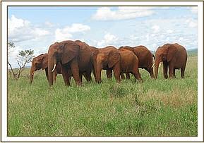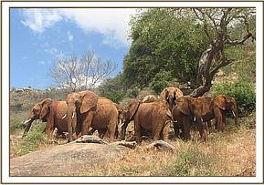 Natumi’s group comprises Ilingwezi, Laikipia, Mukwaju, Edie, Icholta, Lolokwe, Nyiro, Mweya, Thoma, Solango, Burra, Seraa, Mpala, Irima, and Morani and it was a great joy for their Keepers to see them all again on the 15th March after 3 long months as perfectly wild elephants, all present and correct, looking happy and well fed. Likewise the Keepers were greeted with unbridled joy by their erstwhile charges. Rumbled elephant greeting, and trumpets filled the air, accompanied by urinating which denotes excitement and joy, plus trunks wrapped lovingly around human necks. The orphans spent about an hour back at their old home base in the company of their erstwhile human family before leaving again to enjoy their now established status amongst the wild elephant community of Tsavo East National Park.