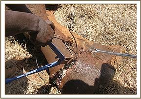 This elephant, approximately 15 years old, had a snare deeply embedded on the mid left fore leg. This was obviously a long standing injury as tissues were covering the snare apart from the posterior part of the leg where the snare knot was visible with a pussy discharge. It required radical surgery to remove the snare, and one could only imagine the unspeakable agony this elephant had endured for months. Despite the injury the elephant was able to use the leg, and the prognosis for a recovery is good, but it is likely there will always be a lameness to the leg.