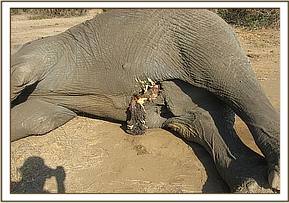 Another injured bull elephant was brought to the Unit’s attention with an injury on the ventral abdomen. It had a large piece of tissue hanging from the ventral abdomen. Upon immobilisation, an extensive injury was found that was heavily infected. The cause was difficult to determine. Only the skin was involved, the abdominal muscles looked intact. It was cleaned thoroughly and treated topically with hydrogen peroxide and water. All necrotic tissues were trimmed. Thereafter, the injury was infused with lugol’s iodine and an antibiotic ointment. A high dose of a long acting antibiotic was given. We will continue to liaise with the Satao camp manager to find out whether the bull is sighted again and enquire on progress.
