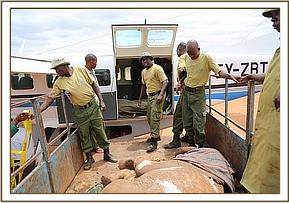 A team of experienced Keepers from Nairobi flew down early morning to join the Ithumba Keepers in preparing Ziwafor his journey back. He was given stressnil, laid on the canvas stretcher and his legs tied. Then the Herculean task of loading him was undertaken with the pilot looking on closely to ensure that all parameters were in order. Of course it was sad for Ziwa to leave his orphan friends, and wild friends too, but he was returning to many more, and once in Nairobi he was placed into his old stockade which he remembered immediately. He seemed completely settled and calm and absolutely made a pig of himself on the soft green vegetation that Nairobi offered thanks to the recent rains, a delicious change from the dry grewia of Ithumba in the peak of the dry season. The next day he was out with the others like an old hand, familiar with all the Nursery routines, infact it was as if he never left!