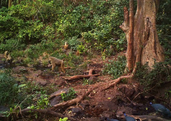 Animals do not usually notice the cameras but one curious baboon did come in for a closer look when the cameras were first installed. It must have been covering the light sensor with its hand as the photo was taken with an infrared flash.