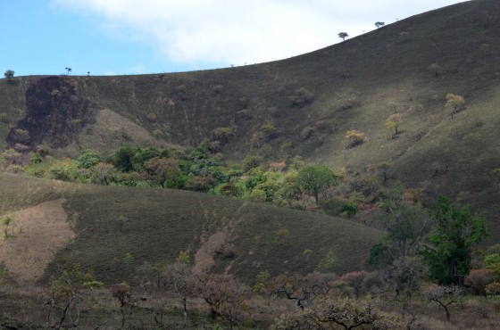 Warm, moist air moving inland from the coast is pushed up the side of the southeast end of the Chyulus cooling and condensing as it reaches the crests of mountain ridges where it forms patches of thick forest. These forest caps sit like desert islands atop a sea of open grassland, their edges so clearly defined it seems there is some invisible boundary which prevents their advance. In actuality, the forests are kept from spreading, at least in part, by annual bushfires, which are intentionally set by herdsmen to kill off the dead grass and scrubland to encourage the growth of fresh shoots. The practice is highly effective for creating fertile, productive grazing and has been used for hundreds of years by Maasai pastoralists; however, it does little to improve biodiversity.