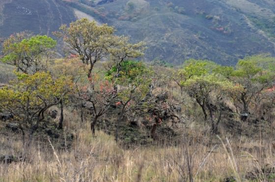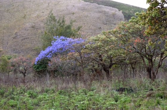 Each year, thousands of birds, insects, small mammals, plants and trees die as a result of uncontrolled bushfires, and the forests, which might otherwise continue covering the hills, are halted in their tracks. Unfortunately, managing this activity is difficult. The Chyulu hills have only been protected under the management of Kenya Wildlife Services (KWS) since 1983 when President Daniel Toroitich Arap Moi gazetted the Park in order to protect the cloud forests. Before 1983, human settlement had begun to occur in the area, the evidence of which still remains. A derelict house appears as you climb the hill towards the summit, and exotic fruit trees such as guavas, mangos and avacados adorn the landscape. Oddly, these trees do not appear all that out of place anymore and have blended into the surrounding vegetation. Even a lone jacaranda, native to Brazil, standing at the end of an old avenue of Erythrina abysinnica, looks at home in a small valley below a ridge. In full purple bloom, the jacaranda forms a beautiful accent against the muted backdrop. The consequence of such recent settlement is the continuing sense of dependence on the area, mainly for grazing. The grazing in and of itself is not as harmful as the method.